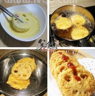 将莲藕去皮后切成连刀片;姜、葱、瘦肉均切碎,加盐、味精拌匀。拌匀的瘦肉末夹入藕片内,鸡蛋打入淀粉内拌匀成全蛋糊,下入藕片挂好糊。锅加油烧热,下藕夹炸至表面金黄色即可。