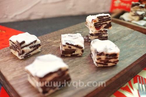 2、自己做雪花酥 做法:混合果干是蔓越莓干、冻草莓干、蓝莓干、猕猴桃干切小粒,混合坚果用熟花生米和小核桃仁,饼干一分为二。