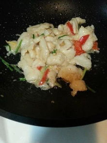 3、鱼片拌入2料腌20分钟,如是能保湿放冰箱里过夜鱼肉会更嫩滑。不粘锅,加油5大匙,置炉上开大中火,放入姜丝炒香)。