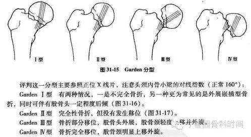 ③经颈型,骨折面完全通过颈部,此型甚为少见,有人认为在老年病人中几乎不存在这种类型。④基底型,骨折面接近转子间线。