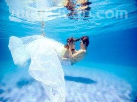 如果在户外的泳池拍摄,更好选择天气晴朗的时候;如果是在室内的游泳池拍摄,可以通过灯光的处理来营造强光下的迷离水下世界。新娘造型水下婚纱照的拍摄,对婚纱的选择也有要求,薄纱面料的轻盈感婚纱最适合水下婚纱照。