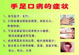 2、手口足病症状:大多数患儿是突然发病,首先表现为发高烧,体温多在38度以上,同时伴有头痛,咳嗽,流涕等症状,体温持续不退,体温越高,病程越长,病情也就越重。