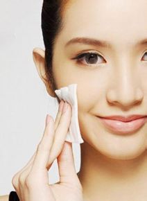 用化妆水充分浸润棉片后,将化妆棉纵向撕成4片,分别贴在额头、两颊以及下巴处进行面膜护理。3~5分钟即可。