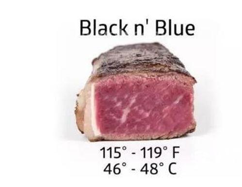 熟度具体划分 近生牛排英文:Blue 通过牛排温度计测量结果,近生牛排的内部温度只有46-48摄氏度,但是近生牛排并不是一块生肉,而是表面已经煎脆了,但是内部还是生肉,摸起来还可能有点凉凉的。